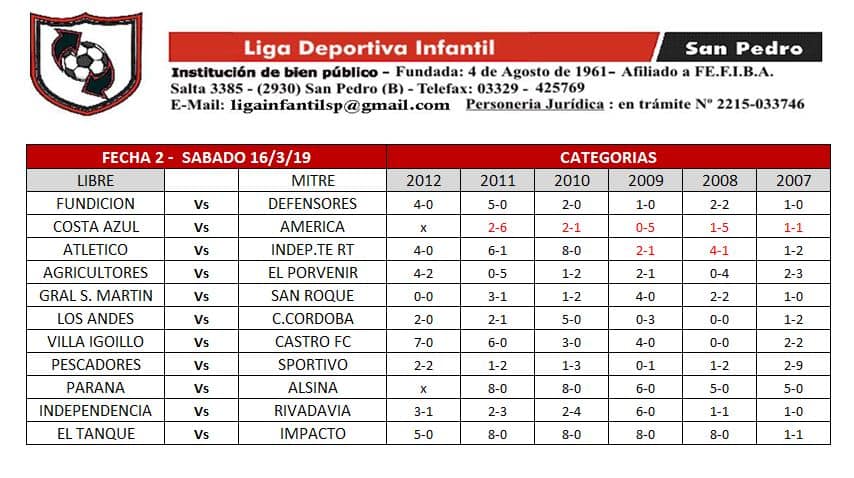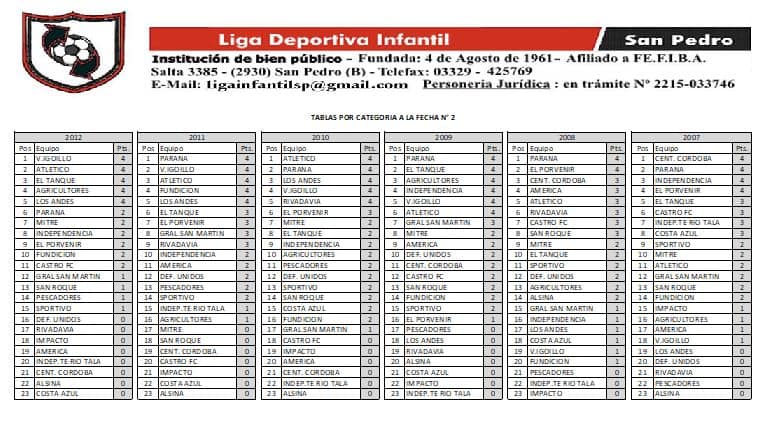 El próximo sábado se disputará la tercera fecha del Torneo Apertura de la Liga Deportiva Infantil. Te informamos de los horarios y repasamos los resultados y posiciones tras la segunda jornada.
