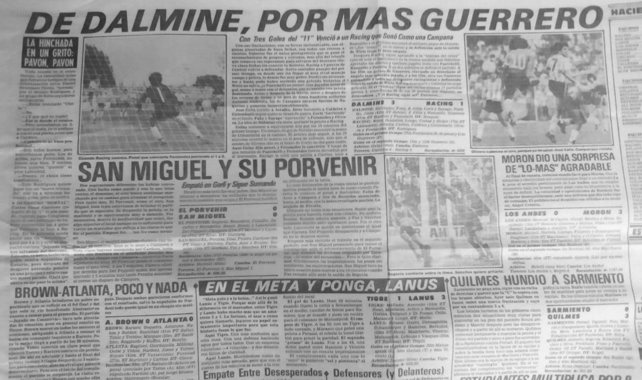 El triunfo ante Racing en Campana fue lo más notable de esa temporada para V. Dálmine por 3 a 1 con tres goles del sampedrino Carlos Omar Guerrero. El cotejo había sido postergado y se jugó un 23 de Octubre (miércoles) a media tarde con un lleno total en Mitre y Puccini. Un centenar de sampedrinos viajaron para ver en acción al «violeta» y a Guerrero, quien no defraudó, jugando un notable partido.
