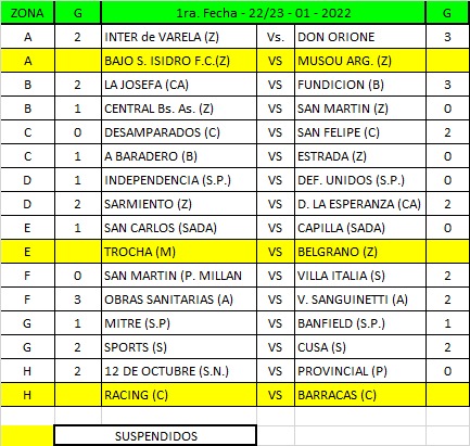 Zona C: Estrada FC (Zarate) vs. Desamparados (Campana) y San Felipe (Campana) vs. Atlético (Baradero).