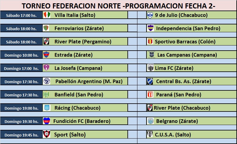 Copa de Clubes: Todos los partidos confirmados Publicación de la entrada:22/01/2020 Categoría de la entrada:Fútbol / Varios Tres cotejos se disputarán el sábado, el resto el domingo, por la segunda fecha de la Copa de Clubes de Federación Norte de Fútbol. Tal nuestro adelanto, los equipos de la Alianza juegan entre las dos jornadas. Compartir: Etiquetas: copa de clubes 2020, Federacion Norte Leer más artículos Entrada anteriorCopa de Clubes: Independencia viaja a Zárate, Banfield y Fundición FC serán locales Siguiente entradaCopa Argentina: El jueves 30 de Enero se realiza el sorteo de los 32avos de final También podría gustarte Masivo encuentro de escuelas de fútbol en Mitre 20/10/2018 Zárate nuevamente el mejor de la región bonaerense 07/08/2018 Torneo Preparación: Goleó Mitre y junto a Paraná son punteros de sus respectivas zonas 29/08/2021