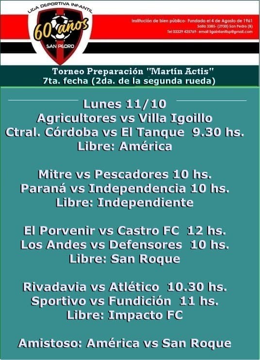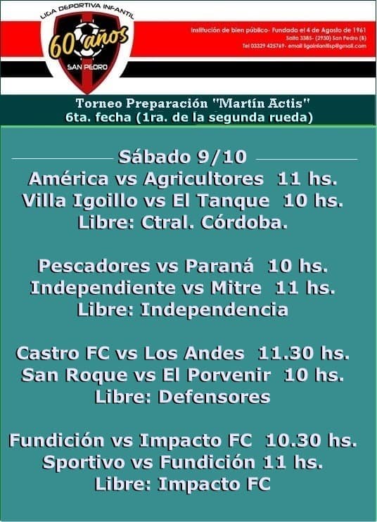 Doble fecha para el baby fútbol Publicación de la entrada:08/10/2021 Categoría de la entrada:Fútbol / Varios La Liga Infantil dio a conocer los días de juego y horarios para la doble fecha que se llevará a cabo este fin de semana largo, programando la 6a. y 7a. jornada, con este orden de partidos: https://www.elclasicodeportes.com.ar/wp-content/uploads/2021/09/WhatsApp-Video-2021-09-22-at-18.36.44.mp4 Compartir: Etiquetas: liga infantil de futbol de san pedro Leer más artículos Entrada anterior¡Boxeo suspendido! Siguiente entradaMTB: Varios sampedrinos en el «Desafío al Valle del Río Pinto» También podría gustarte Copa de Clubes: Las Palmeras-La Esperanza se juega el domingo 06/02/2019 En el recuerdo: Paraná y su triunfo más rutilante 02/11/2020 Matías Erbin preparó a Castaño para retener el titulo mundial 03/03/2019