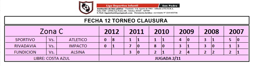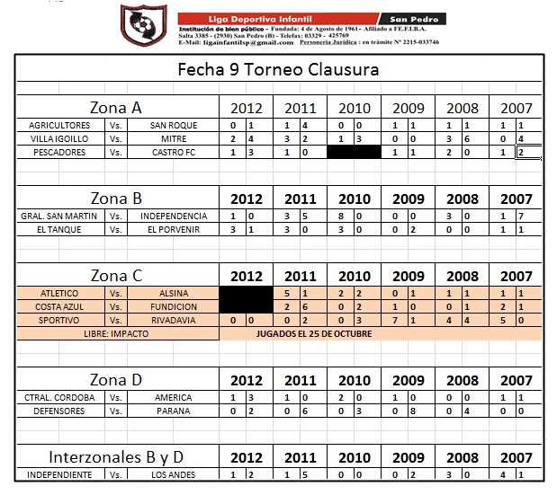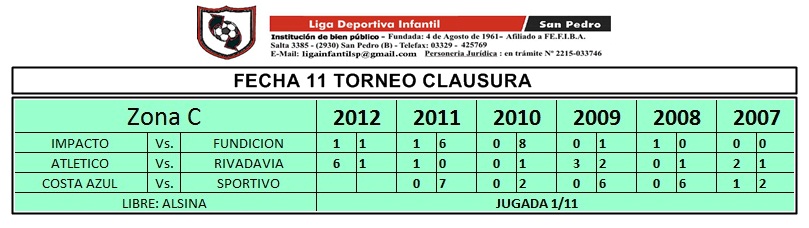 Los resultados de los partidos de la 9na. fecha que este sábado disputaron los equipos que componen las zonas A, B y D y los que se dieron en la 11° y 12° de la C, integrada por los clubes de Baradero. Los Andes también dio la vuelta en 2011 y El Tanque en 2012.