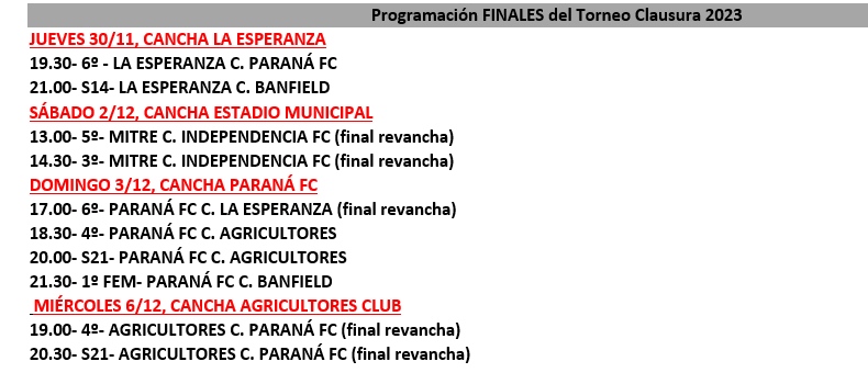 Fútbol local: así se jugará lo que viene… Publicación de la entrada:28/11/2023 Categoría de la entrada:Fútbol / Varios Finales en todas las categorías habrá esta semana y la entrante, definiendo los últimos certámenes del Clausura. Pase y vea!! Compartir: Leer más artículos Entrada anteriorTorneo infanto juvenil: Resultados y posiciones hasta la fecha 3 Y 4 Siguiente entradaFederal A: la gran final se juega en La Rioja También podría gustarte Una nueva experiencia para Juan J. Paz 08/03/2020 Superliga Argentina: Racing empató en Victoria festeja el título 31/03/2019 Primera A: Defensores Unidos se lo dio vuelta a Mitre y por ahora se salva de todo! 18/09/2022