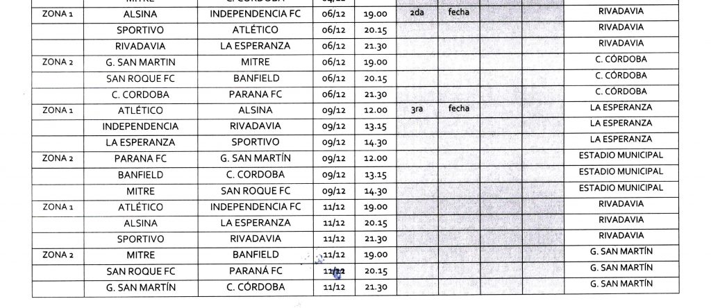 Torneo infanto juvenil: La programación de la ronda final Publicación de la entrada:04/12/2018 Categoría de la entrada:Fútbol / Varios La categoría sexta juega este martes la primera fecha de la rueda final a dos zonas, los ganadores se enfrentarán por el título y los dos segundos por el tercer y cuarto puesto. los horarios hasta la cuarta fecha. MARTES 4 DE DICIEMBRE 1ra fecha, cancha Rivadavia Baradero Zona 1 19.00 horas: Alsina vs. Sportivo 20.15 horas: La Esperanza vs. Independencia FC 21.30 horas: Atlético vs. Rivadavia Zona 2 1ra fecha, cancha Paraná FC 19.00 horas: Paraná FC vs. Banfield 20.15 horas: San Roque FC vs. Gral. San Martín 21.30 horas: Mitre vs. C. Córdoba Compartir: Etiquetas: SEXTA DIVISIÓN Leer más artículos Entrada anteriorCuatro atletas de Pescadores participarán del Cruce de Los Andes Siguiente entradaExcelente encuentro de Pelota a Paleta en San Pedro También podría gustarte Reunión con Clubes en el Municipio local 12/01/2021 Torneo Preparación: América derrotó a CADU 03/03/2019 Fútbol local: Todos los resultados en divisiones inferiores! 31/07/2022